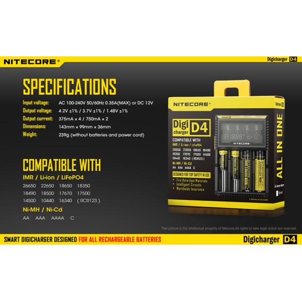 The Nitecore D4 is a universal smart charger compatible with almost all cylindrical rechargeable batteries, thus eliminating the need to own several chargers. The D4 automatically detects Li-ion, Ni-MH and Ni-Cd batteries, and through manual selection is also capable of charging LiFePO4 batteries. Intelligent charging circuitry selects the optimal charging mode (CC, CV and dV/dt) for a given battery and each of the D4’s four microcomputer-controlled charging slots then monitors and charges the battery independently. Furthermore, an integrated digital LCD screen clearly displays charging progress, voltage, current and time while an intelligent automatic power-off function terminates current when charging is complete. The Nitecore D4: The world’s most advanced fully-automatic digital charger. It’s as simple as insert, detect and charge.